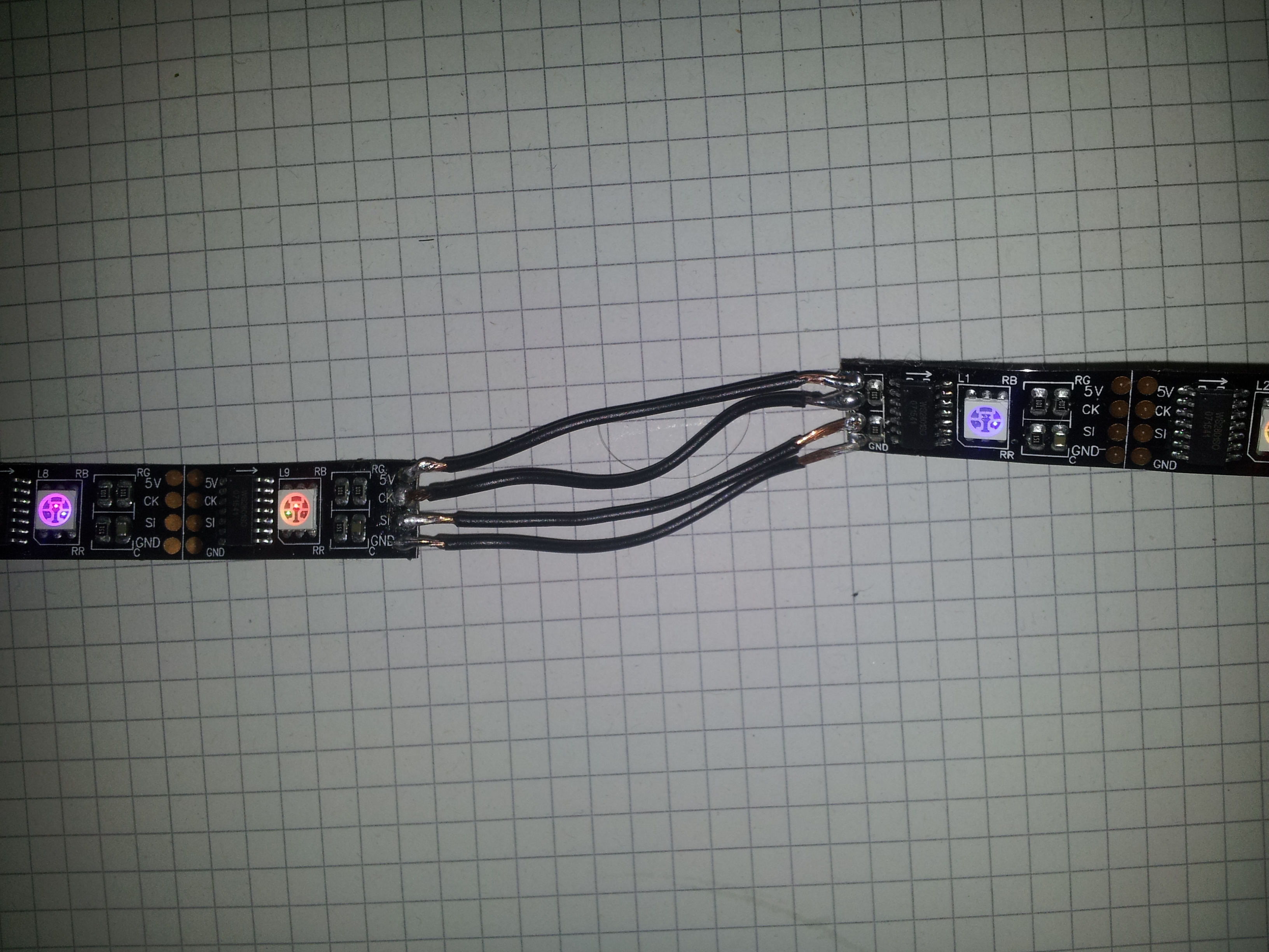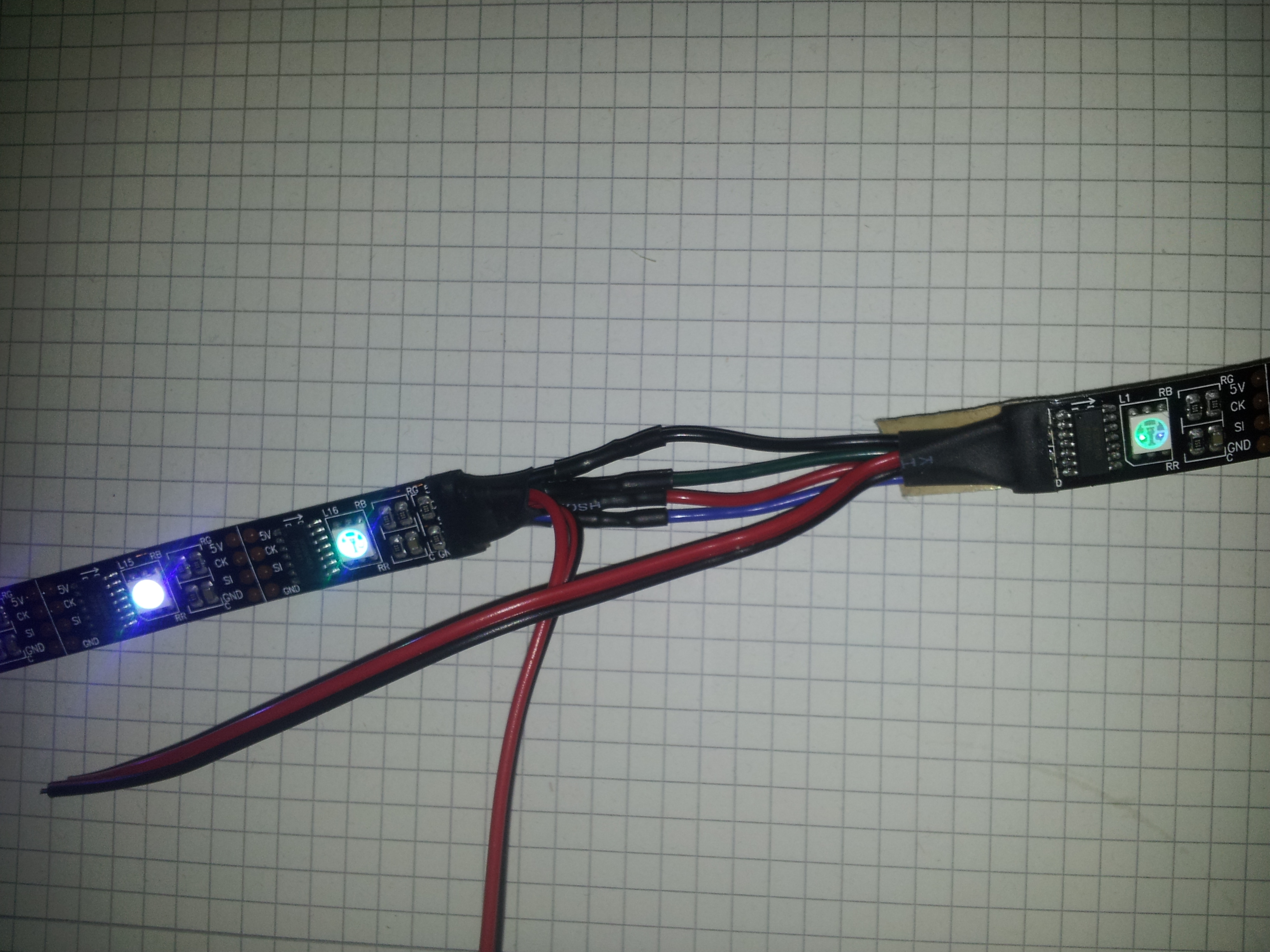 Alle Lötstellen sehen gut aus. Habe die WS2801-LED's. Mit der vorkonfigurierten Datei von Aki (http://powerpi.de/forum/viewtopic.php?f=8&t=13) kann ich zumindest per App einen Teil der LED's sauber ansteuern und bekomme auch gewünschte Effekte. Kopiere ich meine eigens eingerichtete config-Datei...