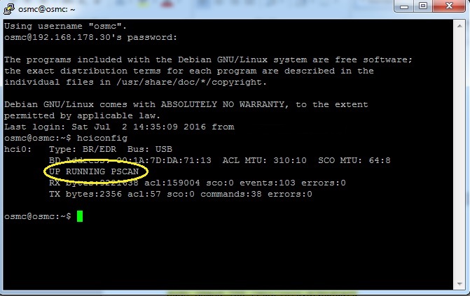 Um zu überprüfen ob der USB Bluetooth Dongle vom Pi erkannt wurde, loggt man sich im Terminal ein (z.B. mit Putty / IP:22 osmc/osmc) und gibt dort folgenden Befehl ein: