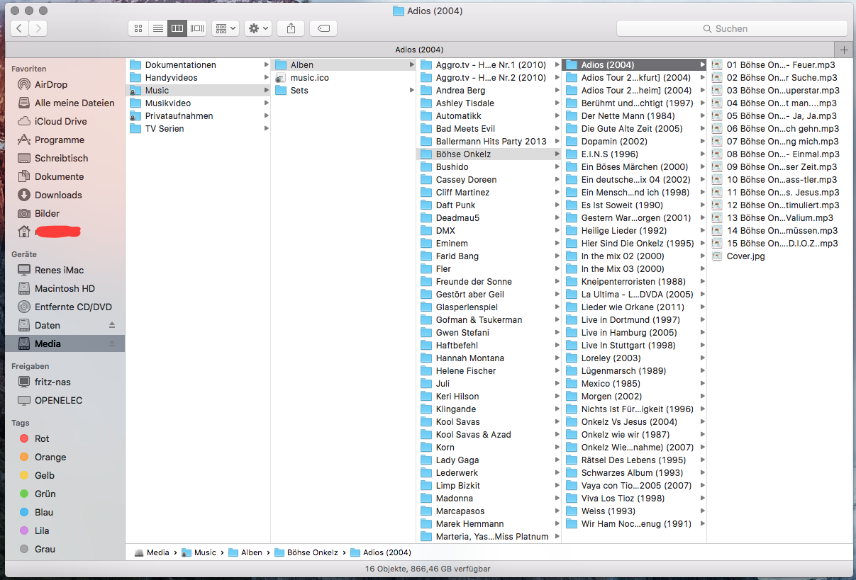 Die Musikdateien liegen auf der ext. Festplatte (gleiche wie Filme und Serien), fein sortiert nach Künstler (jeweils ein Ordner). ITunes Format!