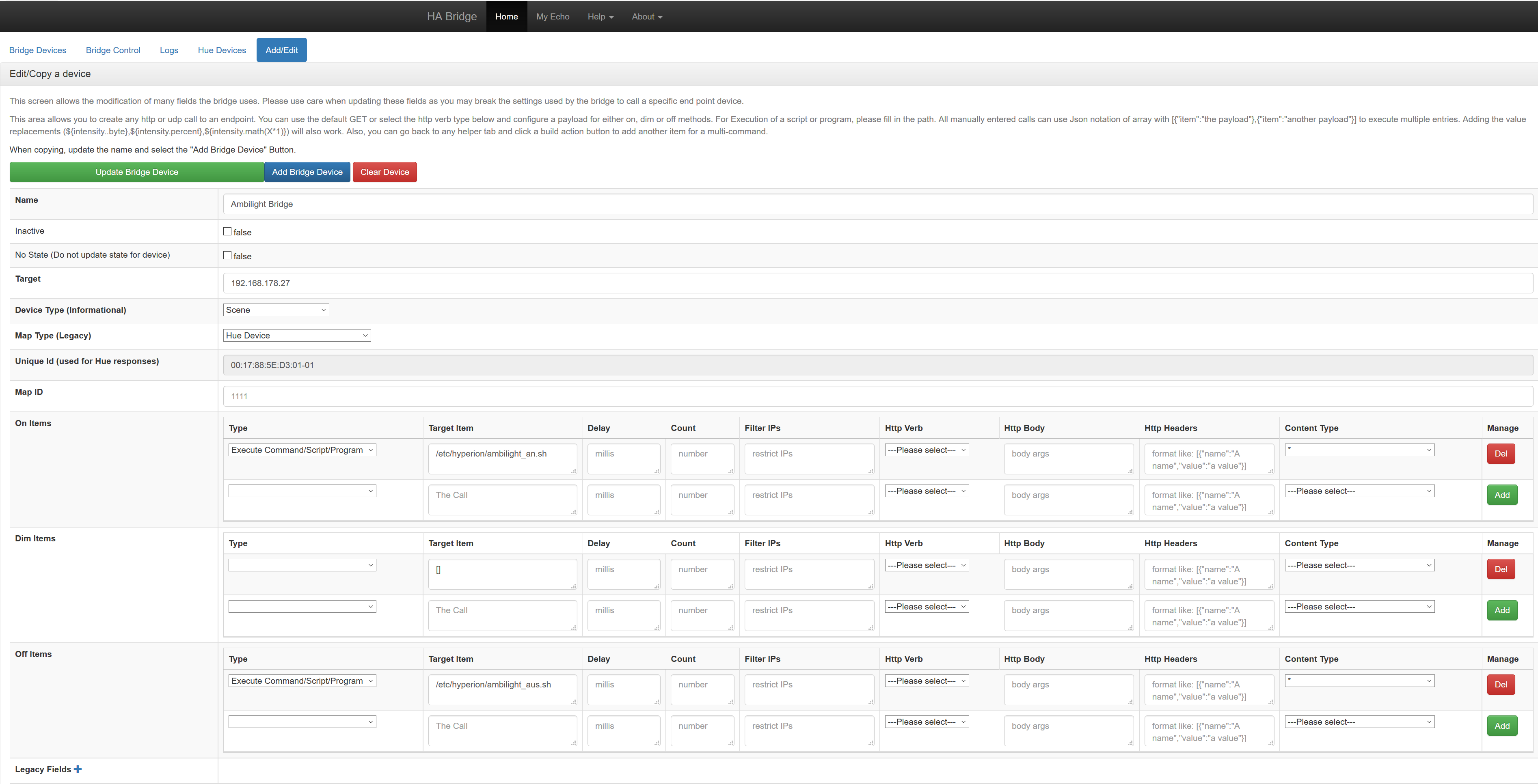 2. In habridge hab ich jetzt eine Hue Bridge angelegt und ein Startscript für den Befehl AN hinterlegt, der den Hyperion Service killt und mit der richtigen hyperio.config.json startet sobald ich "Alexa, schalte Ambilight ein" sage.