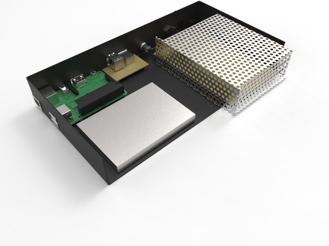 Das Netzteil soll RPi, Ambilight und HD speisen, an die Front kommt der IR Empänger und Status LEDs hinter Lichtleitern.