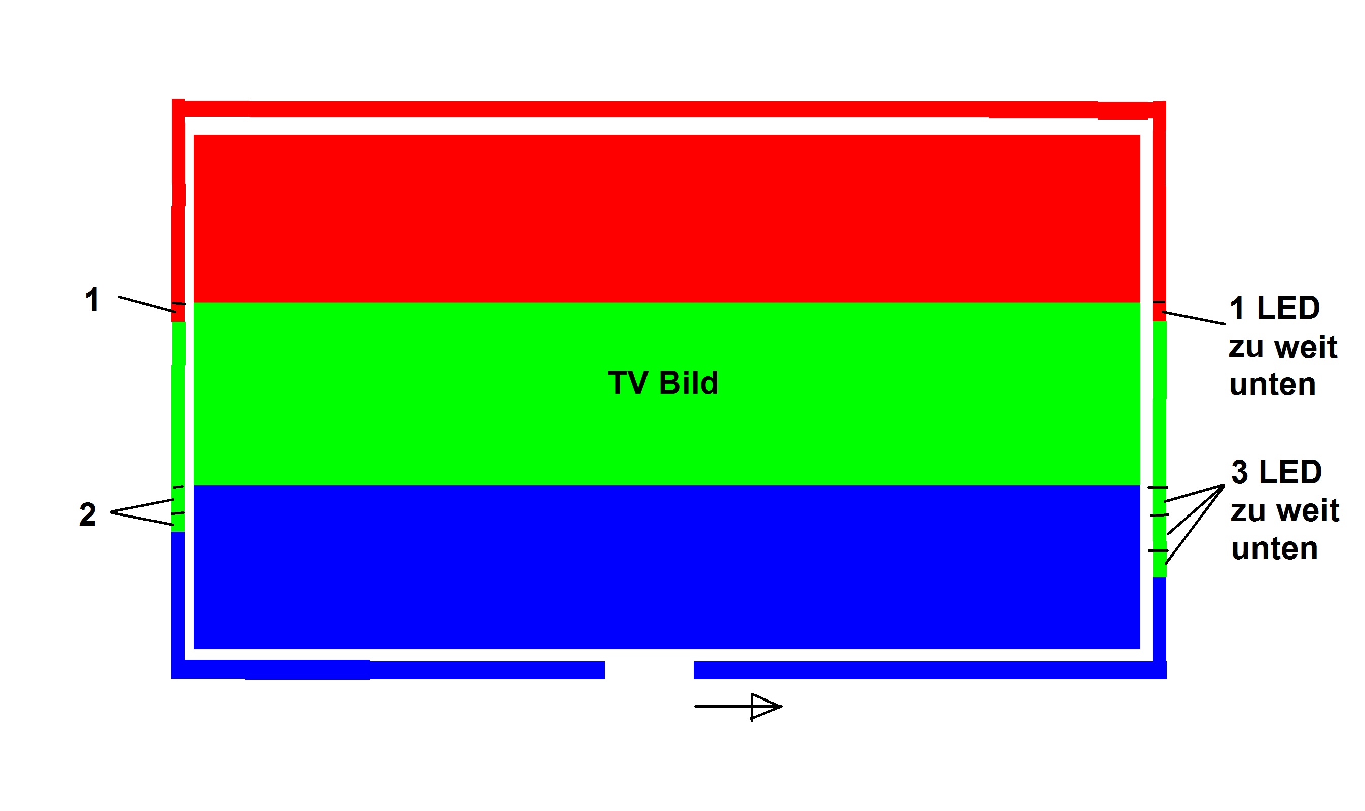 Mach doch mal nach Möglichkeit ein Bild von der Rückseite deines TV und wo du da die LED angebracht hast (zumindest soweit möglich, da er ja wohl an der Wand hängt.)