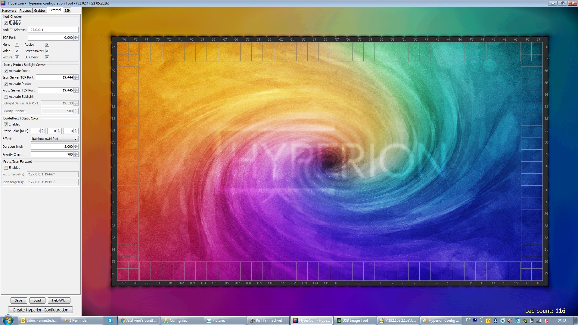 Leider ist das Paket mit den Eckverdbindern verloren gegangen, weshalb ich den LED Strip noch nicht geteilt habe. Allerdings müssten die LEDs ja unabhängig davon angesteuert werden. Die Hyperion Konfig habe ich auf den geplanten Einsatz ausgerichtet (Zahl der LEDs bereits abgemessen und verteilt)