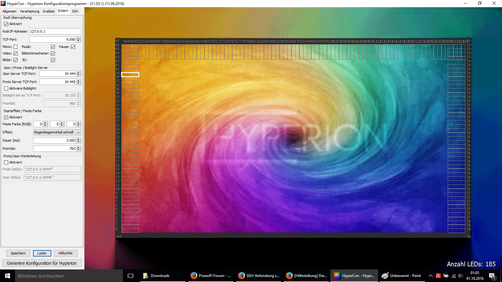 Sobald ich mit dem HyperCon Tool anfange ist allesvorbei und nichts geht mehr. Dummerweise scheint die Version die ich habe,nicht mit der in der Anleitung überein zustimmen, mal abgesehen von der Sprache. Ich probiere und lese jetzt schon seit Tagen und bekomme es nicht über einen externen Player zum laufen. Hätte esgerne so wie es hier: http://powerpi.de/ambilight-fuer-jedes- ... leitung/#1