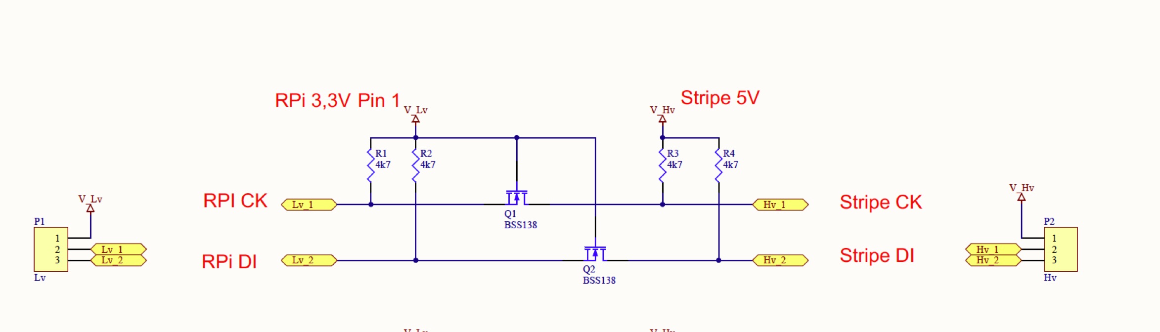 Hi den Schaltplahn hab ich nicht dazu bekommen. Hier aber mal ein Bild vomn der Platiene. LV=3V; HV=5V ; dann hab ich 4 Kanäle LV1-LV4 bzw HV1-HV4.