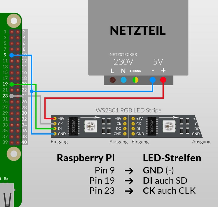 Hi Habe das Problem, das ich sie nur zum weiß leuchen bekomme, wenn ich im Betrieb einmal kurz Pin 19 ab und wieder dran mache. Es leuchten dann alle Weiß bis auf die ersten beiden. LED 1 blinkt dann in verschiedenen Farben und LED2 ist aus. Das geblinke geht aus, wenn ich die Masse von den 5V am Pi und dem Stripe Netzteil verbinde. Dann sind die ersten beiden led`s dunkel. Konfiguriert hab ich so, das die gesamte rolle (300 LED`s) dran sind. Hab das ganze noch nicht verbaut, da ich es erst mal zum laufen bekommen wollte.