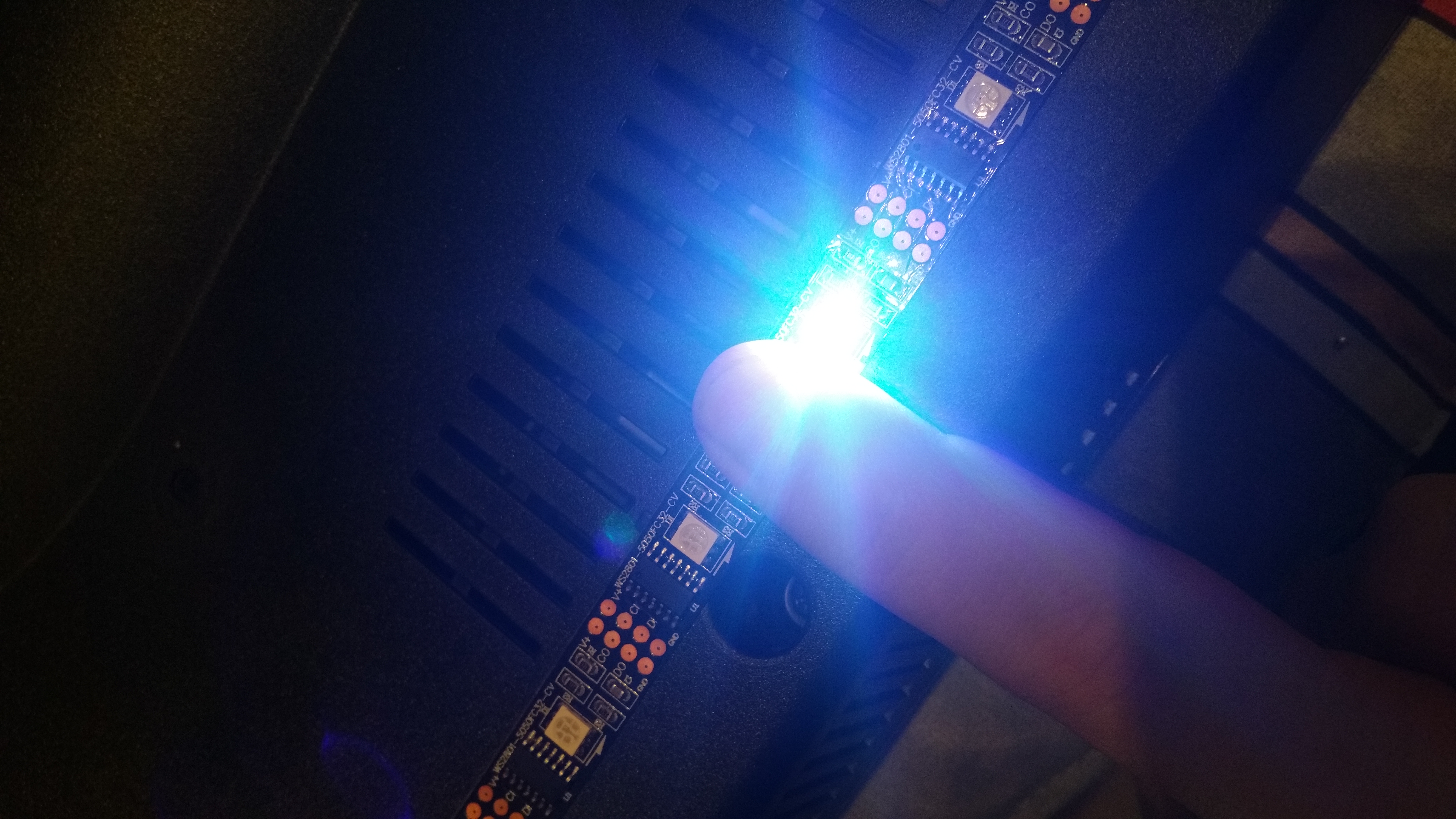 EDIT: wenn ich diese schwarzen teile am streifen anfasse die vor der led selbst sind fängt diese led auch an zu leuchten solange mein finger drauf ist