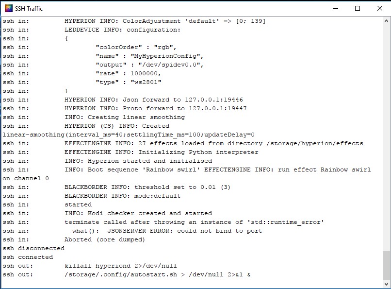 So...jetzt geht gar nichts mehr bei mir. Die Stripes werden nicht mal mehr über SSH im Hyperion angesteuert. Im SSH Protokoll stand was ganz komisches drin. Den Screen dazu wollte ich hier mit reinsetzen aber es gab Probleme bei der Übermittlung.Es leuchten zwei LEDs. Ich musste unten rechts V+ nochmal anlöten, nicht dass ich mit V+ an Data gekommen bin oder woanders dran gekommen bin und es mir die Stripes durchgehauen hat.