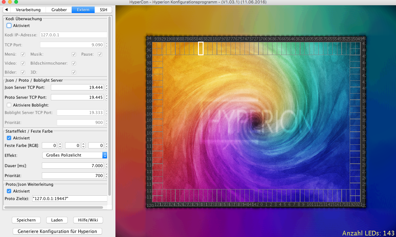 Soeben habe ich getestet ob sich die dunkel bleibenden LEDs verschieben, wenn ich den Startpunkt in Hypercon verändere. Resultat: Es bleiben immer die gleichen LEDs dunkel. Auch eine Änderung ob sich LEDs in der Ecke befinden, brachte keinen Erfolg. Ich vermute daher einen Hardware Fehler?