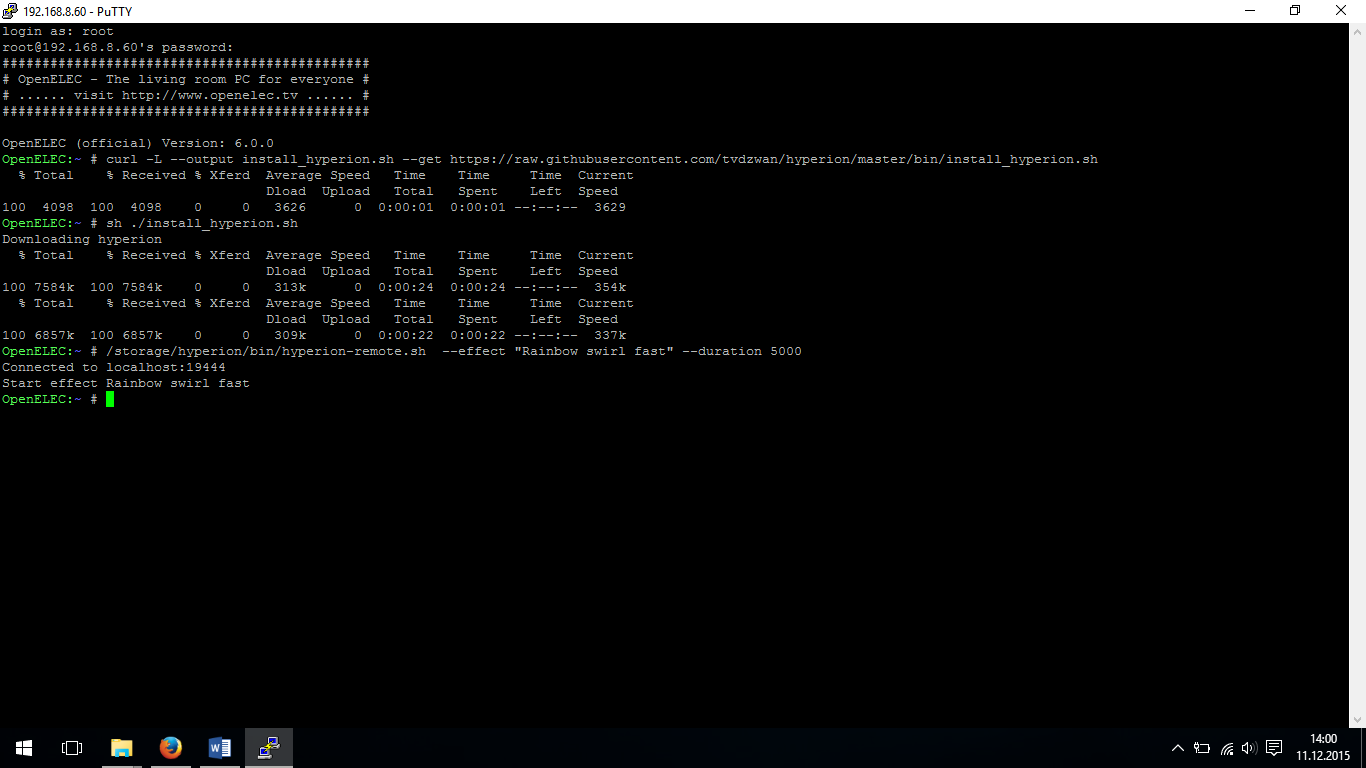 mein Hyperion funktioniert nicht mehr richtig. Ich habe von OpenELEC 5.0.8 auf das Neue 6.0.0 geupdatet via Update Ordner. Jetzt habe ich das Problem, dass das Ambilight nicht mehr funktioniert. Es leuchtet nur noch eine LED und das auch nur in rot. Ich habe versucht, das Hyperion nach einer Anleitung drüber zu installieren aber leider ohne Erfolg. Dann habe ich OpenELEC komplett neu installiert und Hyperion aktiviert. Leider leuchtet immer noch nur eine LED. Vorher hat alles super funktioniert.