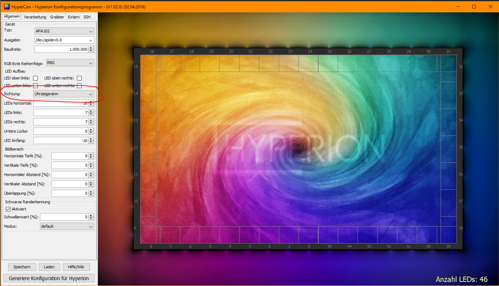 Wenn ich dieses Testbild laufen lassen, dann läuft der grüne punkt genau verkehrt herum um meinen TV. Und wenn der Balken auf dem TV oben lang läuft habe ich kurz gar keine LED an.