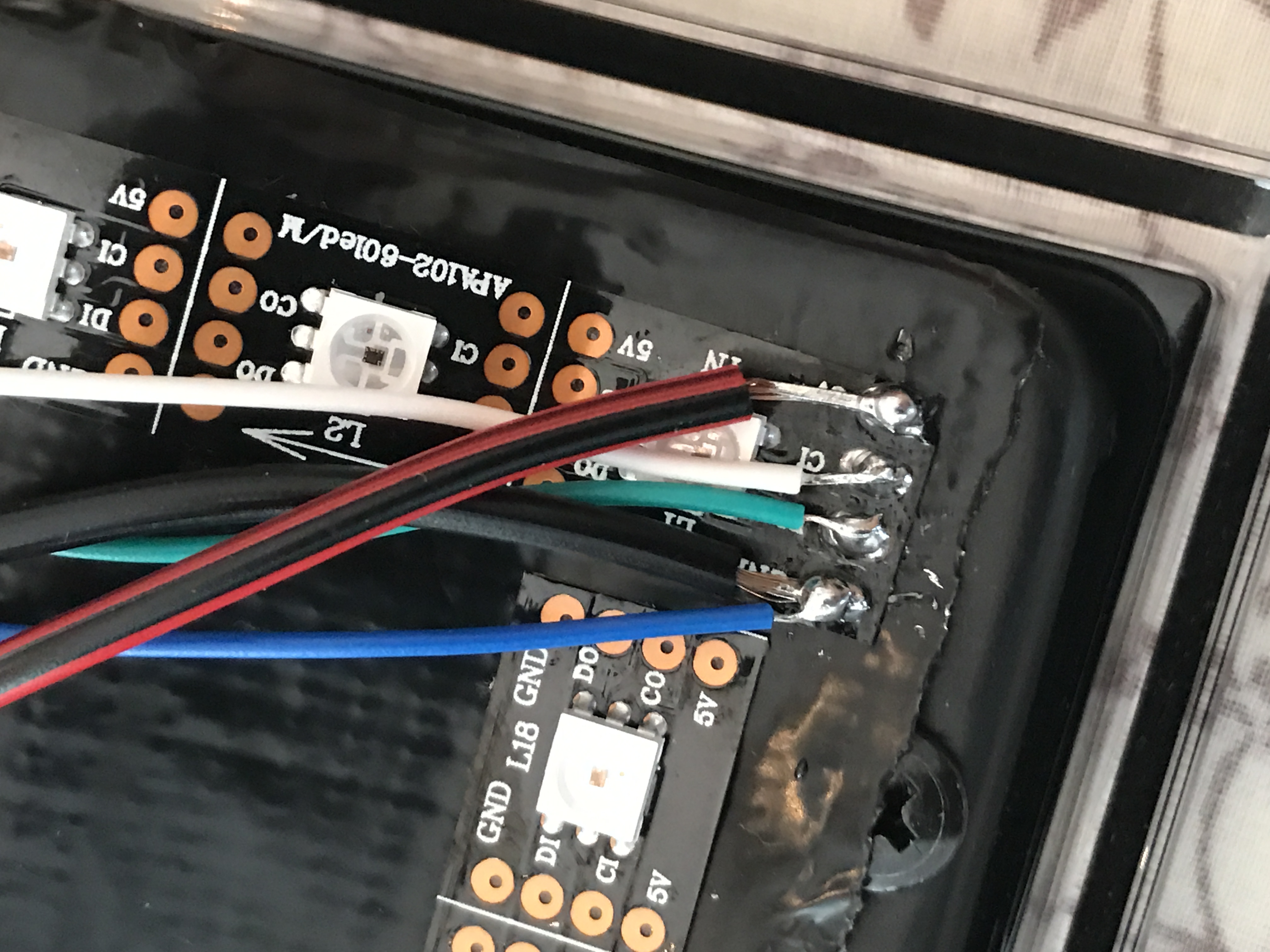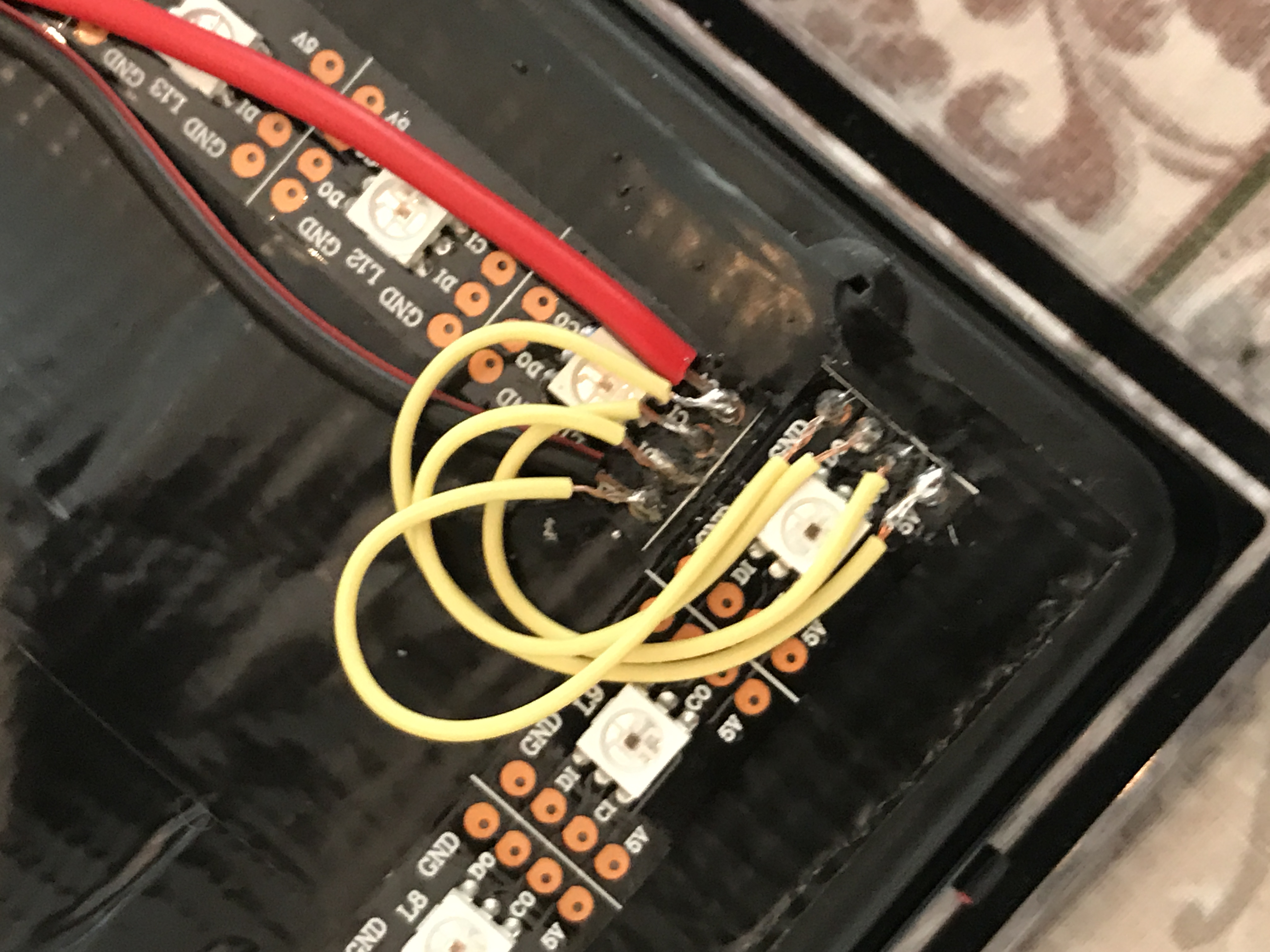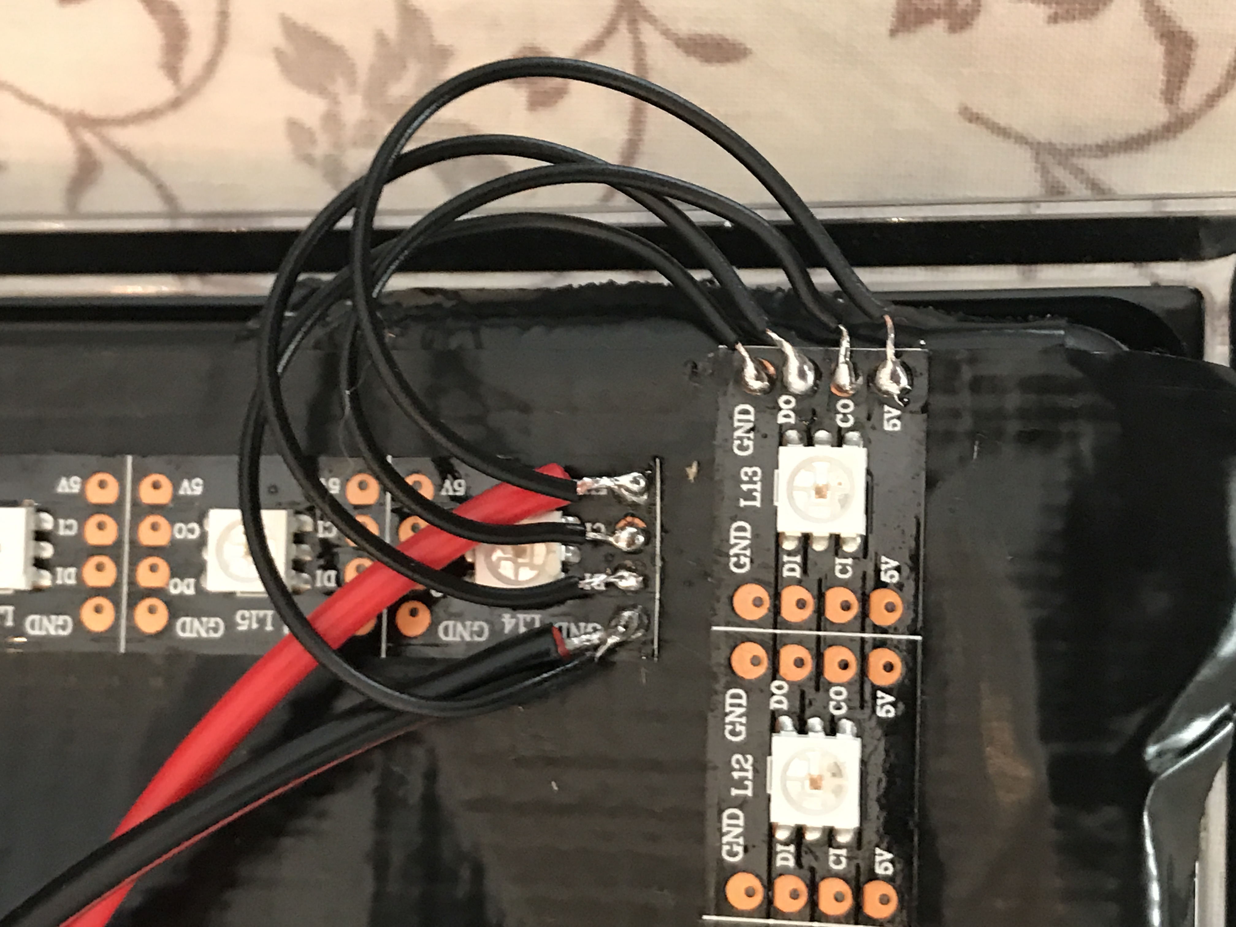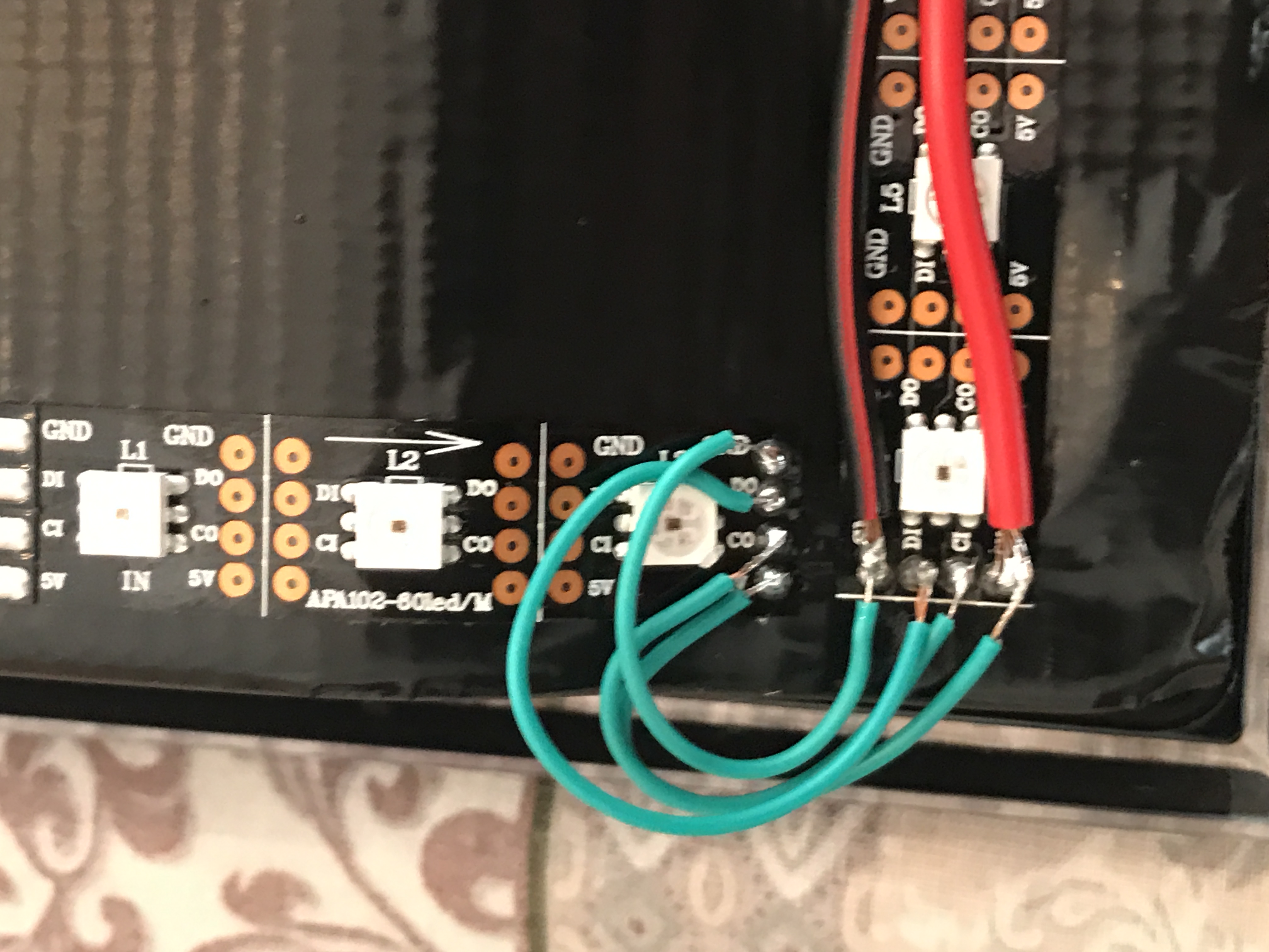 1. LEDs sind bei mir die APA102 mit 60 LED/m von AliExpress. Oben und unten jeweils 63, links 37 und rechts 35. Also 198 LEDs.