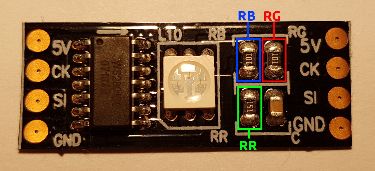 Daraufhin habe ich mir ein LED-Stück angeschaut. Eine LED hat 3 Widerstände, RB, RG und RR. Vermutlich sollte es Resistor-Blue, Resistor-Green und Resistor-Red heißen, also die 3 Vorwiderstände für Rot, Grün und Blau. Eine Messung hat jedoch ergeben, dass RB für Blau, RG für Rot und RR für Grün zuständig waren