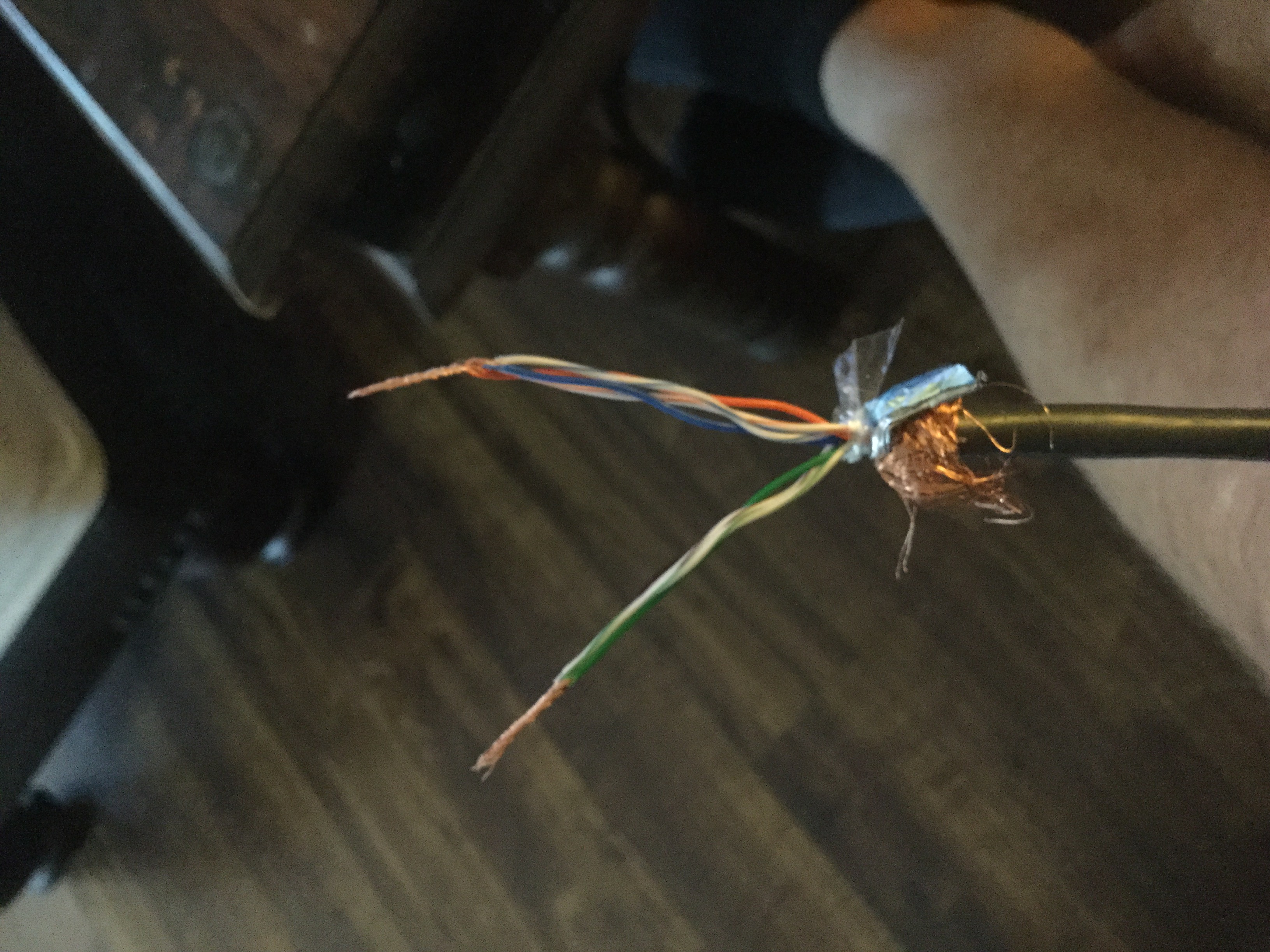 Ich habe hier ein Cat5 Netzwerkkabel. Ca 3 Meter lang. Die 6 Lizen zu 2 verdrillt.
